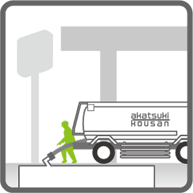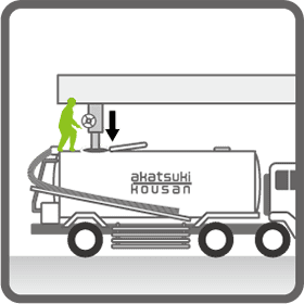 ローリーのホースをタンクにつなぎ、重力やポンプを使って送り出します。